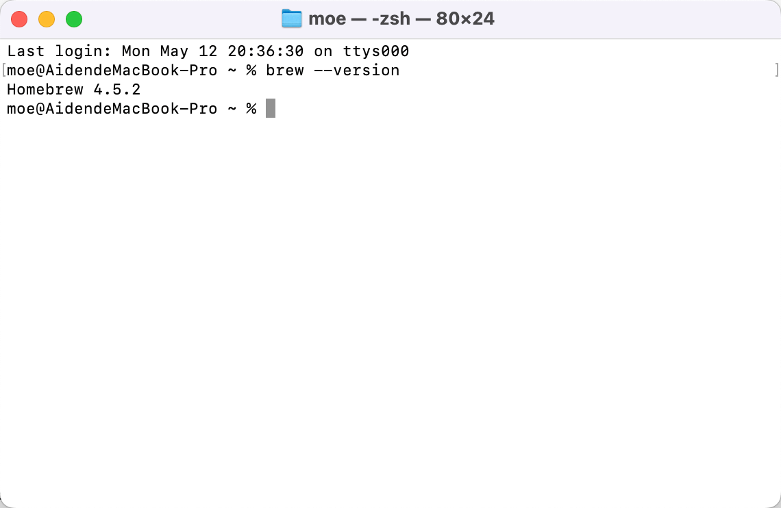配置完成后,关闭并重新打开终端,然后运行以下命令来验证 Homebrew 是否安装成功并添加到环境变量: